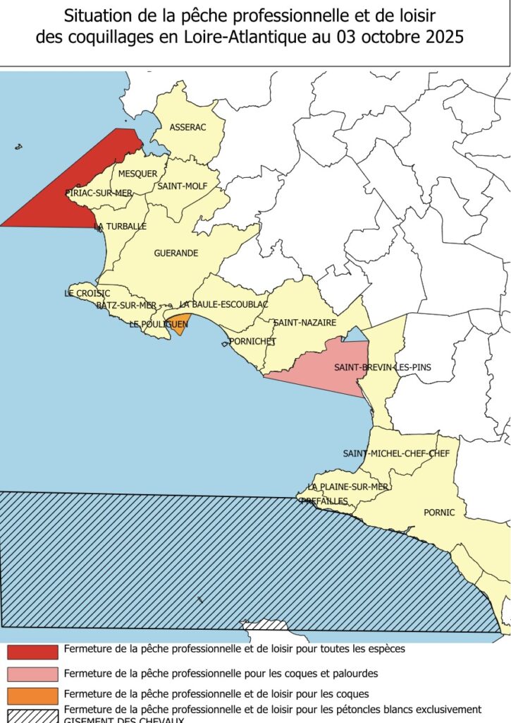 Par arrêté, le préfet de la Loire-Atlantique vient d’interdire la pêche, le ramassage, le transport, le stockage et la commercialisation des coquillages à titre professionnel et de loisir destinés à la consommation humaine en provenance d’une partie du littoral Nord du département.