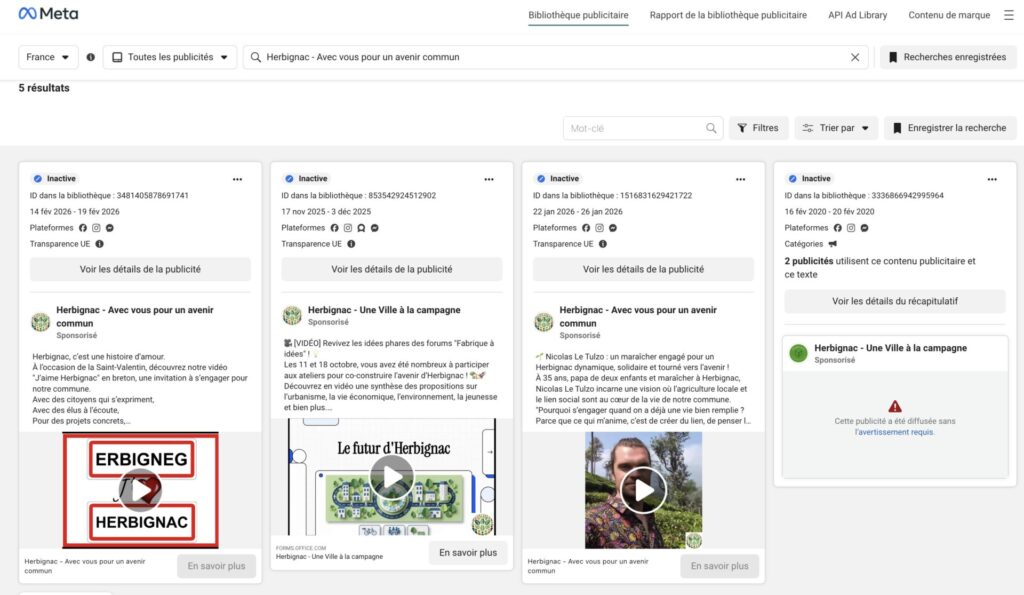 Les informations disponibles sur cet outil indiquent que plusieurs contenus diffusés depuis la page Facebook intitulée “Herbignac – Avec vous pour un avenir commun” (et anciennement « Herbignac – Une ville à la campagne »), support de communication de la candidate, auraient été financés par l’Association Animation Culturelle et Loisirs d’Herbignac (ACLH) (pièce n°1).