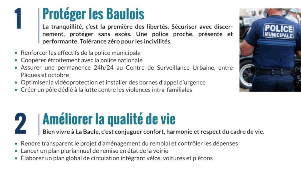 Le programme de la liste « Une Ambition pour La Baule » se veut, d’après son chef de file, équilibré et financièrement responsable. Élaboré à la suite de concertations menées depuis juin 2025 dans les quartiers, il entend rompre avec ce que Marc Lelièvre qualifie de « promesses irréalistes ». La sécurité figure au premier rang des priorités, avec un renforcement annoncé des effectifs de la police municipale, le retour de patrouilles de proximité, une utilisation élargie du centre de surveillance urbaine et l’installation de bornes d’appel d’urgence à proximité des écoles et des lieux très fréquentés.