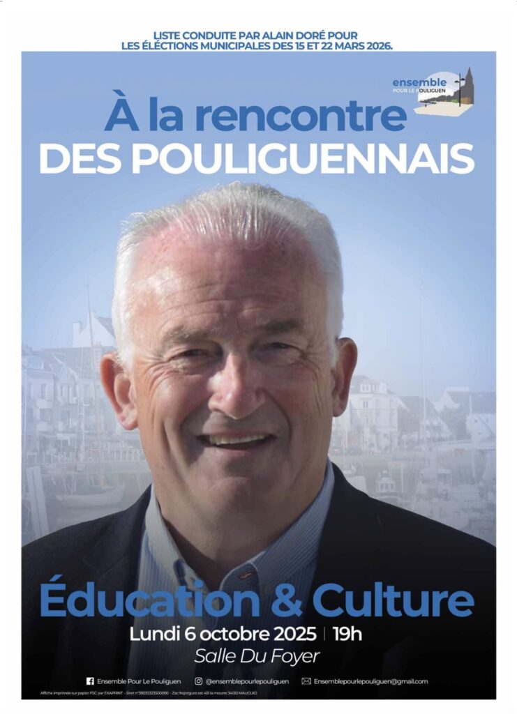 La liste Ensemble Pour Le Pouliguen (EPLP), conduite par Alain DORÉ, organise lundi 6 octobre à 19 heure – salle du FOYER, sa première réunion publique « À la rencontre des POULIGUENNAIS ». Pour cette soirée nous vous proposons d’échanger sur le thème : « Éducation et culture ».
